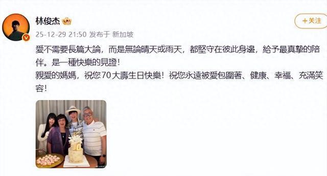2025年12月29日,华语乐坛“金曲歌王”林俊杰的一条微博,在岁末平静的娱乐圈投下一枚重磅炸弹。他晒出与父母及女友“七七”的四人温馨合照,为母亲庆祝70大寿,并写下“爱是坚守在彼此身边”的告白,首次正式官宣恋情。合照中,23岁的网红女友七七亲昵依偎在林妈妈肩头,关系融洽,而林俊杰与女方21岁的年龄差,瞬间引爆全网热议。